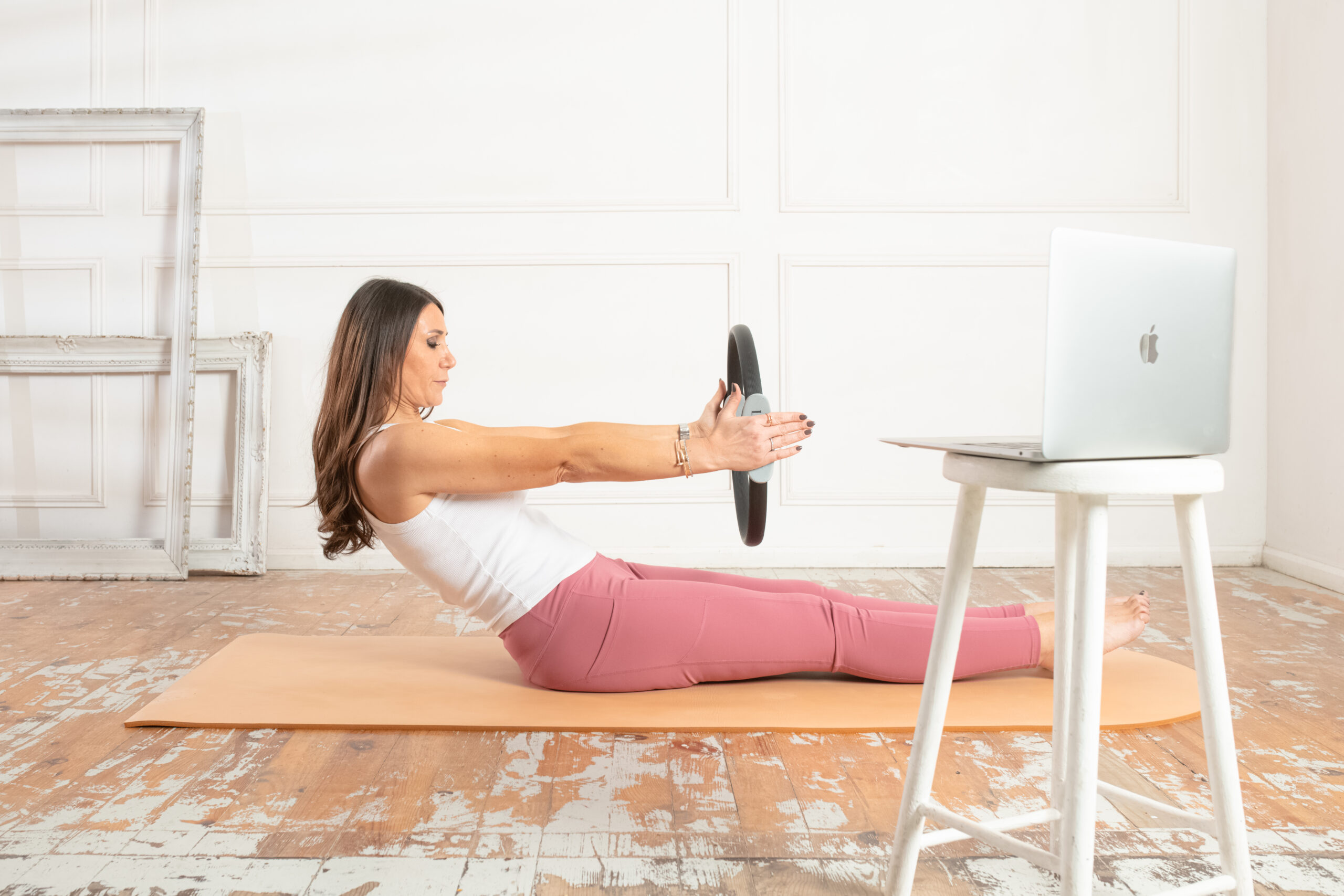 Matériel nécessaire pour suivre le programme: un tapis, 2 briques, 1 petit ballon ( soft ball), 1 Magic circle, 1 élastique